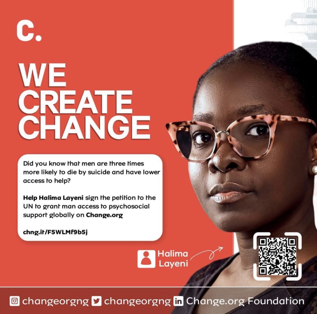 Change.Org We Create Change Initiative spotlights Halima Layeni’s petition to the United Nations to advance Mental Health Support for boys and men across the globe.
