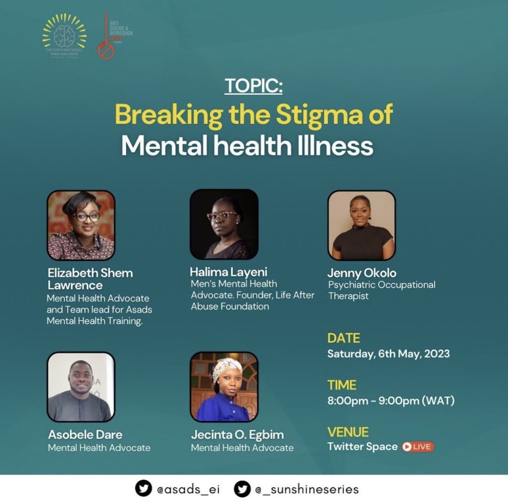 Sunshine Series and Anti Suicide & Depression Squad features LAAF Founder, Halima Layeni on Twitter space on the topic Breaking The Stigma on Mental health